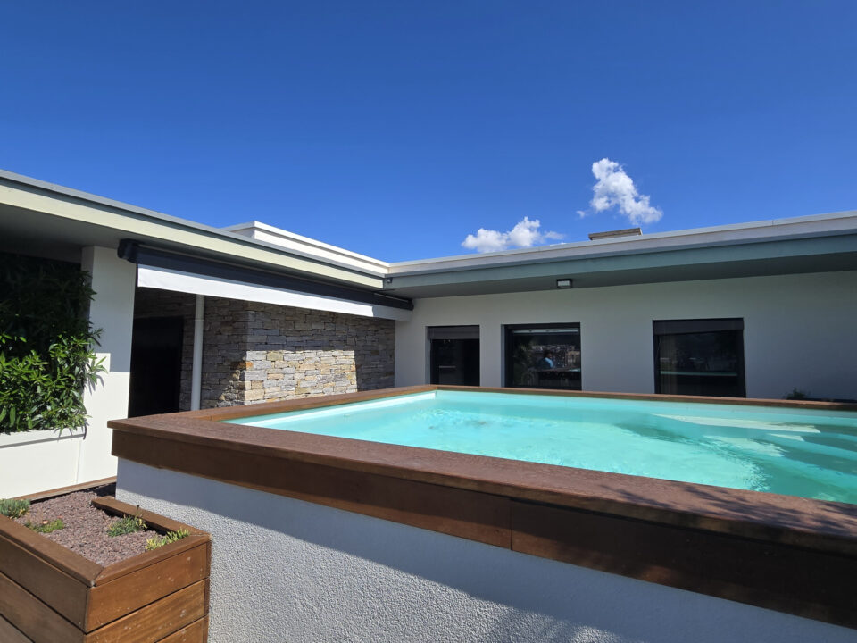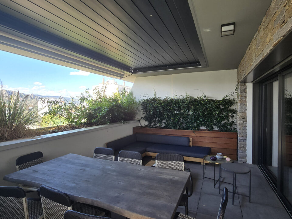 Grande terrasse avec vue imprenable sur l'Ardèche, piscine chauffée et pergola bioclimatique.