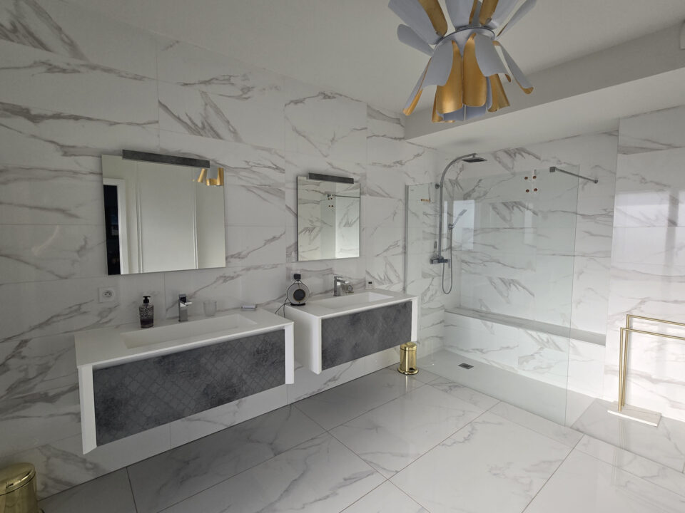 Garage double sécurisé, confort haut de gamme : chauffage & rafraîchissement par le sol, climatisation gainable, huisseries aluminium, volets électriques inclinables.