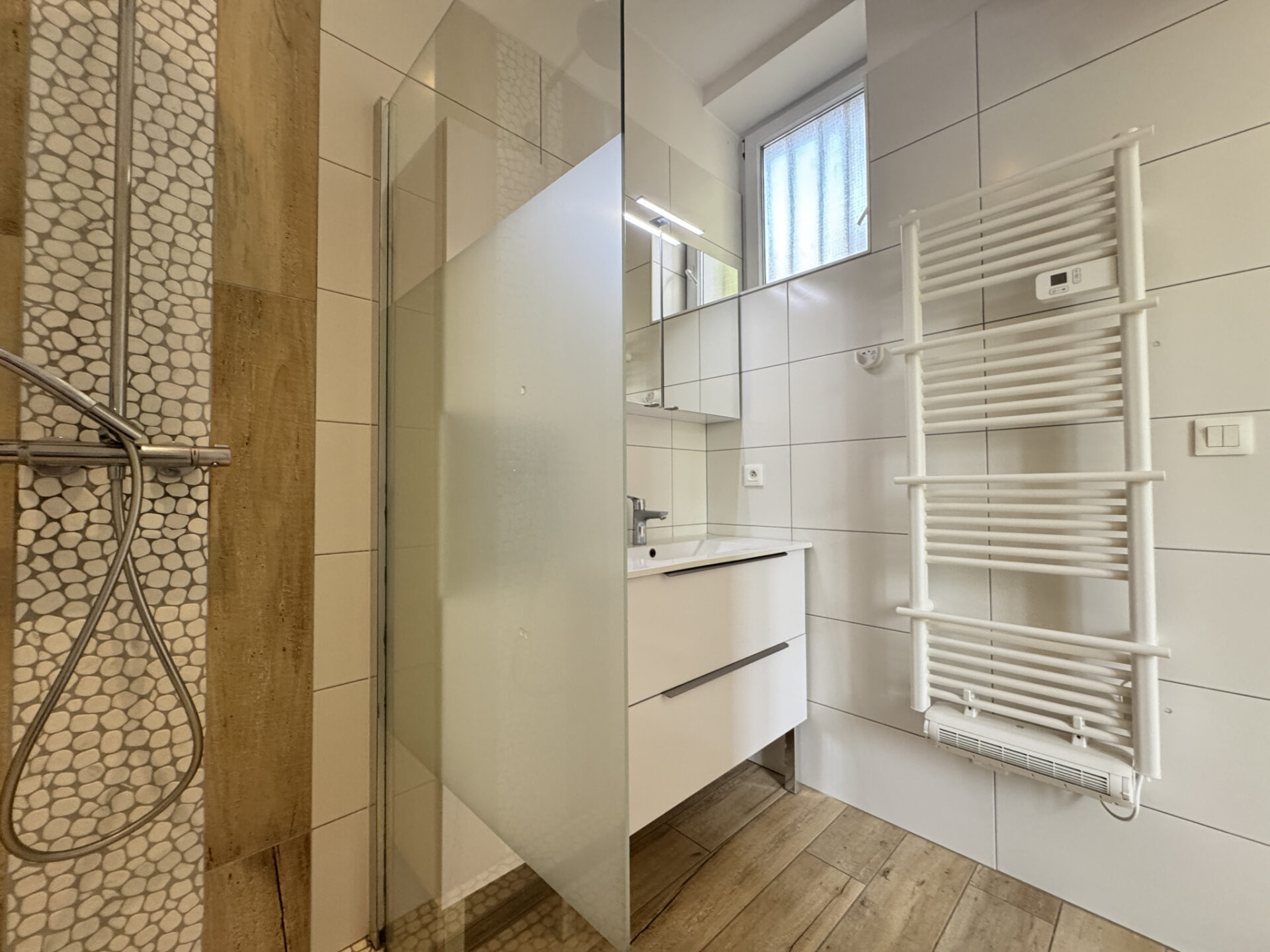 Double vitrage huisseries alu avec volets roulants, chauffage individuel au gaz, chaudière à condensation récente et climatisation inverter, Électricité aux normes.